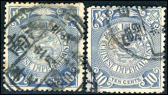 蟠龍藍1角舊票(背稍薄)壹字修飾,附1枚比較